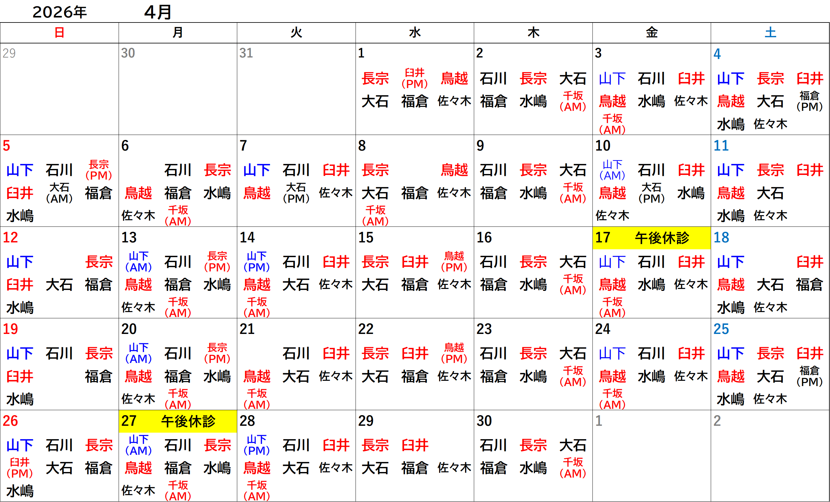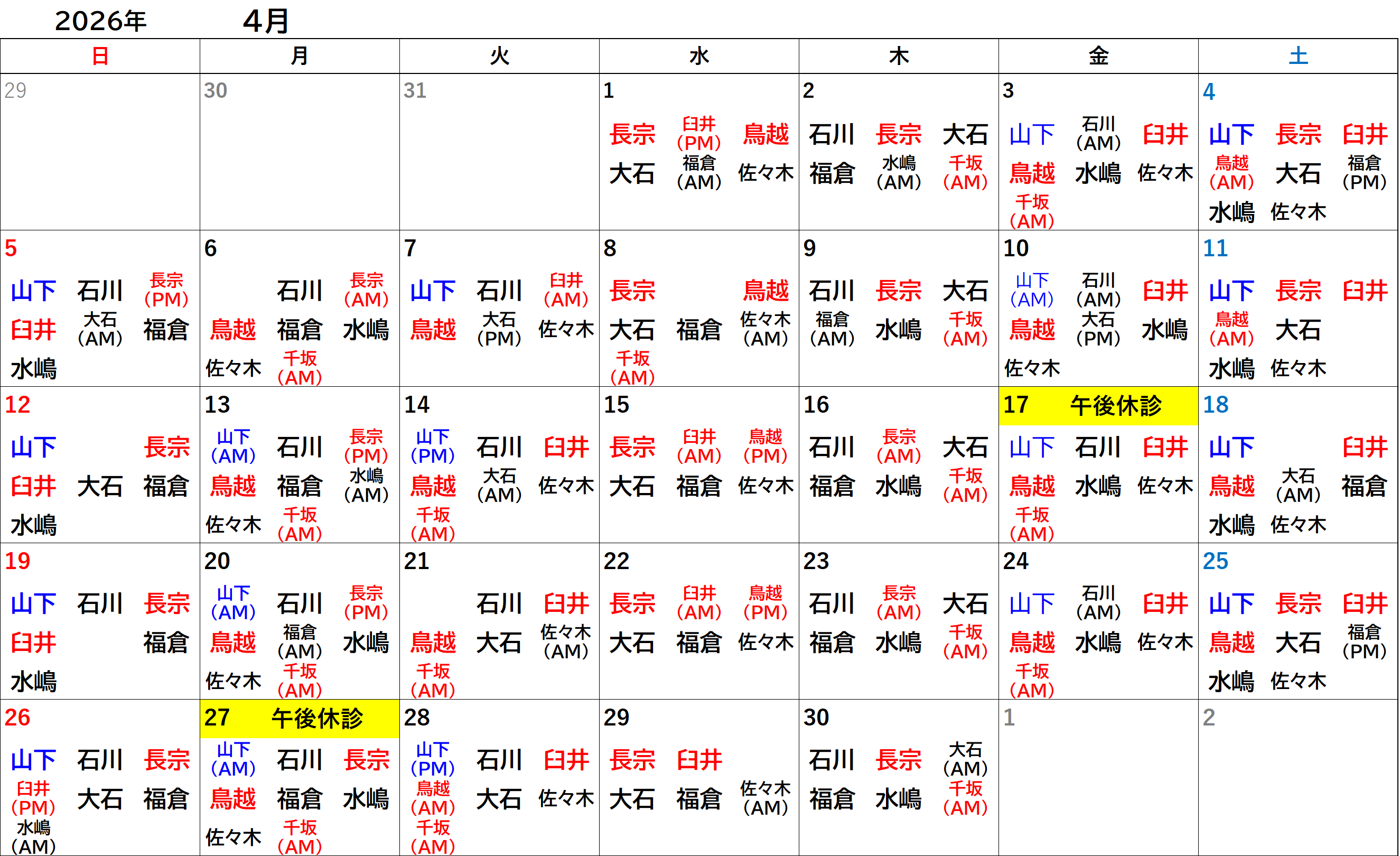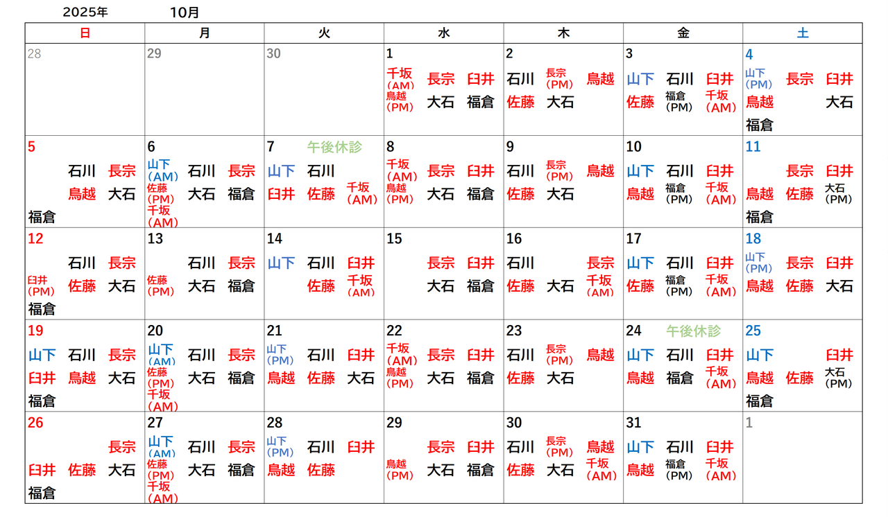 各獣医師の出勤日につきましては、下部にございます獣医師出勤カレンダーをご参照ください。