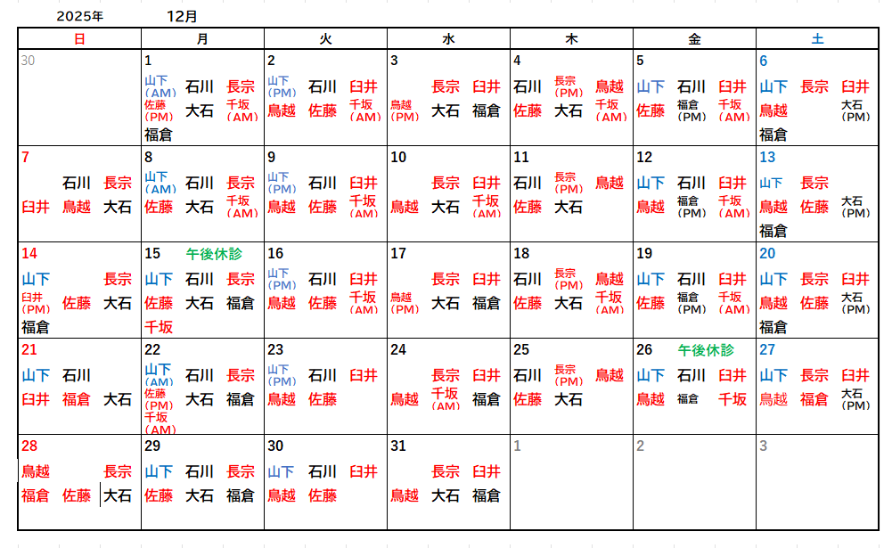 (変動する場合もございますので詳細は下記をご確認ください)鳥越出勤 金曜:第2週、第4週 日曜:第2週、第4週