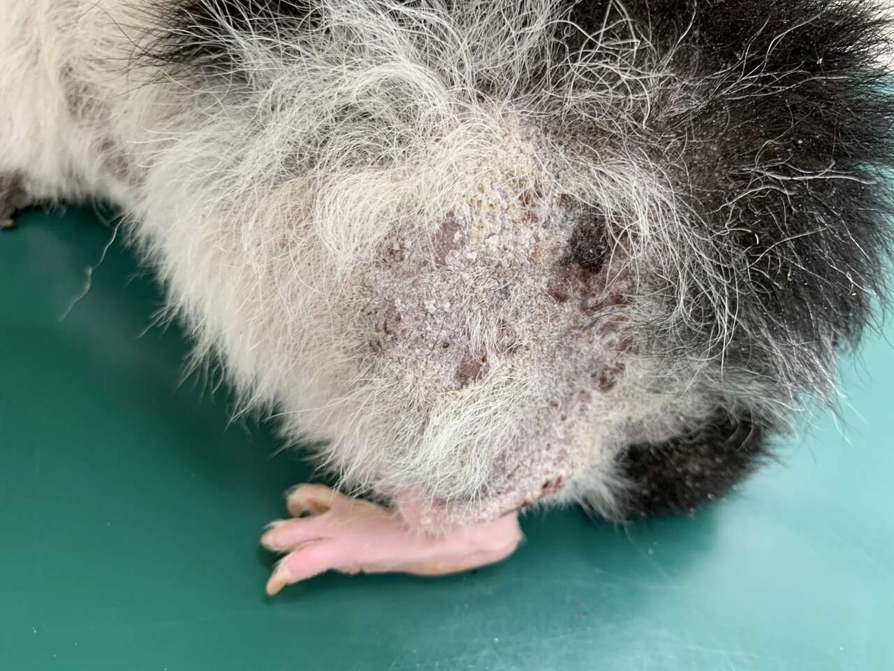 特に大腿部の脱毛とフケが目立ちます。