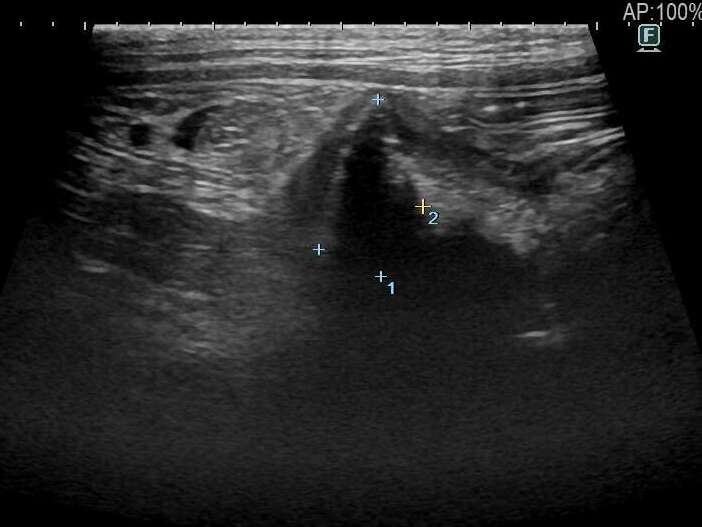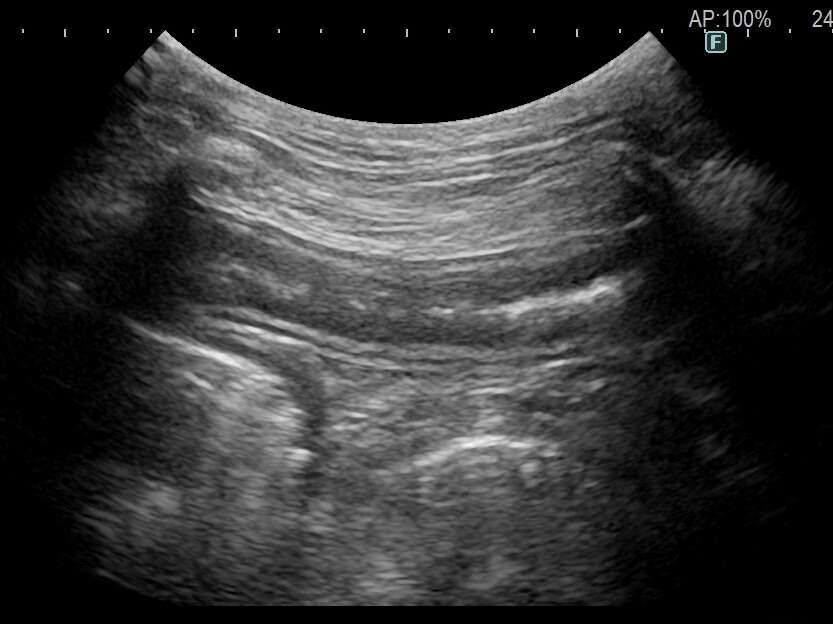 通常消化管内異物による腸の完全閉塞の場合、詰まっている部位から手前の腸は内容物で渋滞し拡張するという特徴的な超音波画像所見が認められます。しかし、本症例では異物は疑われたものの、消化管の拡張所見は乏しく完全閉塞との判断が難しく、手術を行うか悩ましい状況でした。