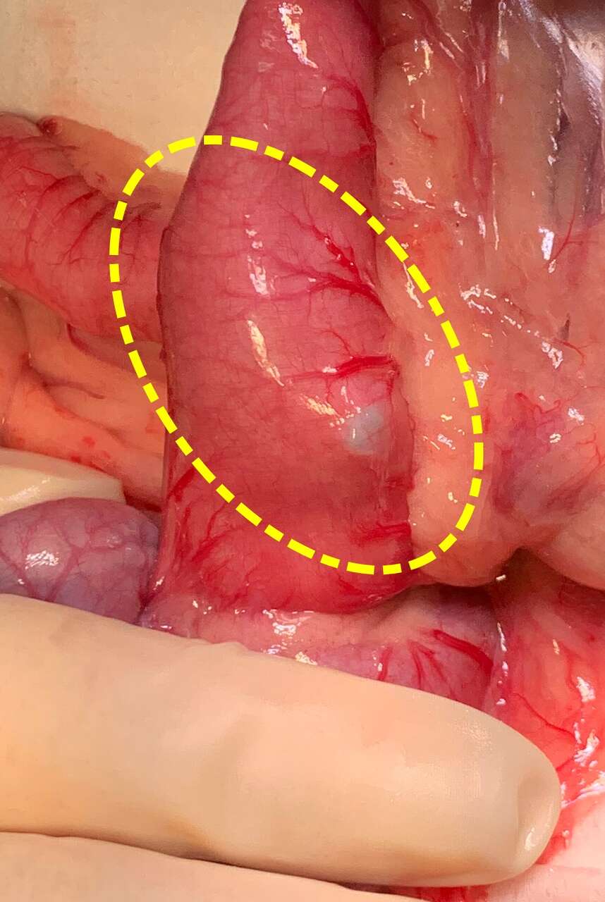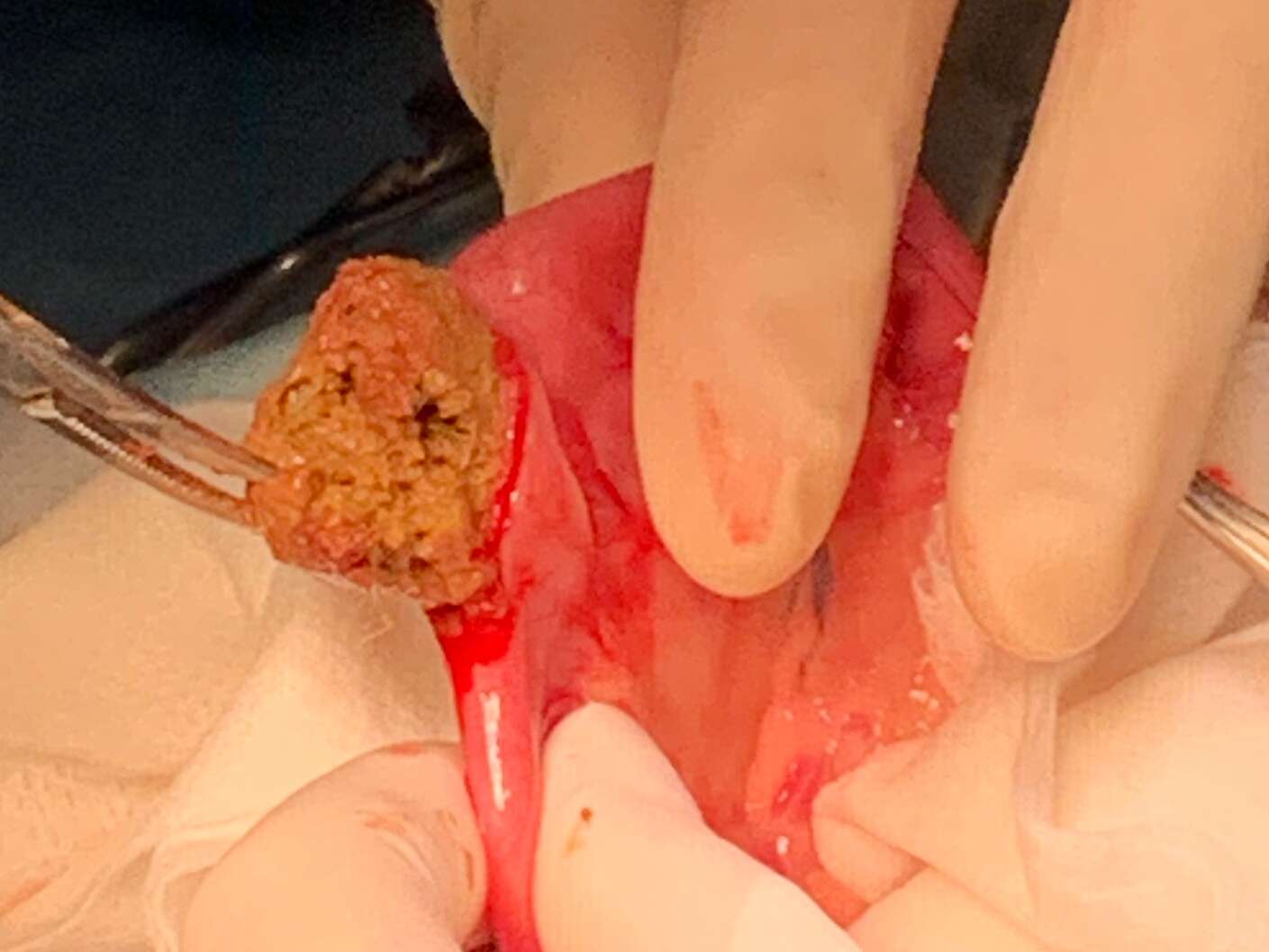 開腹後、消化管全域を精査したところ回腸遠位、盲腸の手前に異物を発見しました。